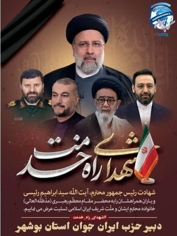 با نهایت تأثر و تألم، رئیس جمهور عزیز و انقلابی، خدمت گزار بی منت مردم، سید مظلوم ، یاور محرومان ، خادم الرضاعلیه آلاف التحیه والثناء ، شهید مجاهد ، محبوب ، پر تلاش و مردمی حضرت آیت الله دکتر شهید رئیسی، که از میان مردم آمد و همواره در خدمت مردم بوده ، با مجاهدتهای بی‌وقفه‌ای که در راستای پیشرفت کشور انجام داد،به رشد و تعالی اقتصادی و اجتماعی کشور کمک شایانی کرده است. ایشان یک انسان بزرگ، متعهد و دلسوز بوده اند و همچنین شهید مجاهد عرصه سیاست خارجی دکتر حسین امیر عبداللهیان ، شهید آیت الله آل هاشم امام جمعه محبوب تبریز ، شهید دکتر مالک رحمتی استاندار خدوم آذربایجان شرقی ، شهید سردار موسوی و همراهان قطعا شهادت برای آنها افتخار و برای ملت ایران ثلمه ای بزرگ می باشد .